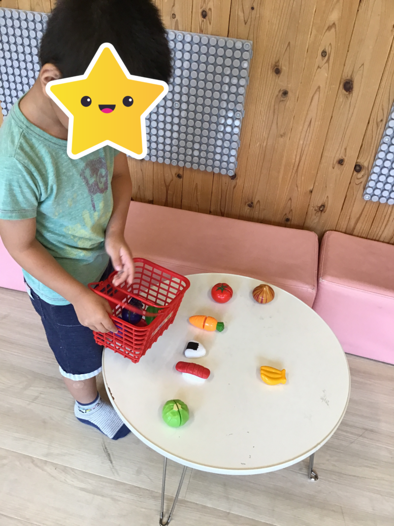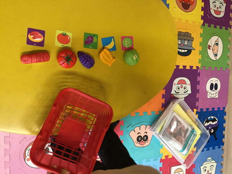 職員から絵カードで示された品物を覚えてお買い物をしてくる
