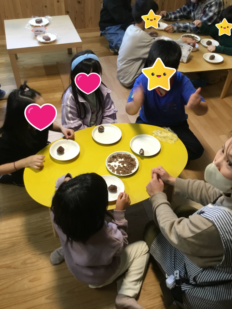 おやつの時間には松ぼっくりケーキを作りお友達と楽しく食べました(^^)